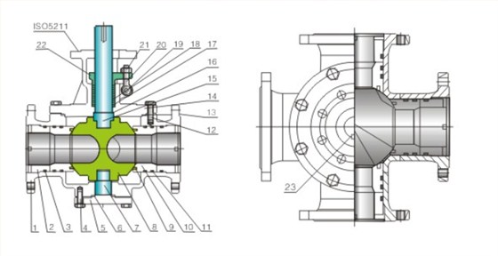 四通球閥在電站系統(tǒng)中稱為雙向供水轉(zhuǎn)閥(在石化系統(tǒng)中也稱空氣換向切換閥),適用于液體、氣體、粉塵、漿料及含固體顆粒介質(zhì)的循環(huán)系統(tǒng)。如:電站機(jī)組冷卻器正反向循環(huán)供水系統(tǒng)。傳統(tǒng)工藝配管方式實(shí)現(xiàn)冷卻正反循環(huán)供水,該裝置所占空間大、成本高、操作繁瑣(每次切換需操作四個閥門)、正想供水時(shí)閥1、3開啟,閥2、4關(guān)閉;反向供水時(shí)閥2、4開啟,閥1、3關(guān)閉。采用四通球閥替代該工藝管匯和閥組的工作原理,簡化程序、方便操作、降低成本、便于控制、同步性好。