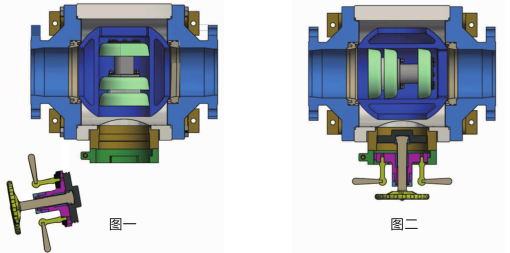 II型是一種帶旁通的清管閥,裝置通較管道內(nèi)徑稍大,在空心球體上垂直于球孔方向開設(shè)兩個(gè)圓型通道,這種結(jié)構(gòu)保證即便在發(fā)射或接收清管器時(shí)清管閥也不會發(fā)生斷流,II型清管閥不能當(dāng)作截?cái)嚅y使用。